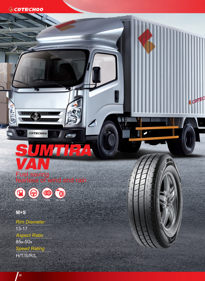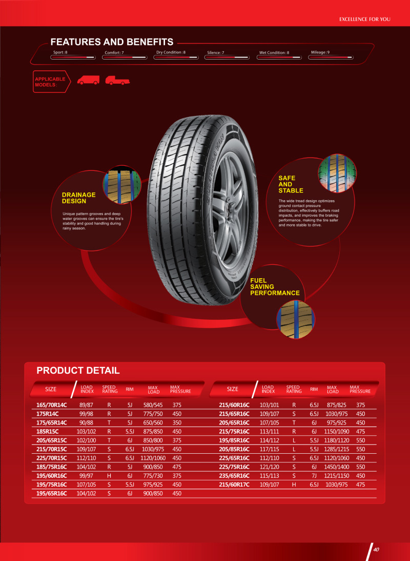 輕型商用車用輪胎,獨特的花紋溝,深排水槽,有較好的排水性和經(jīng)濟燃油性。