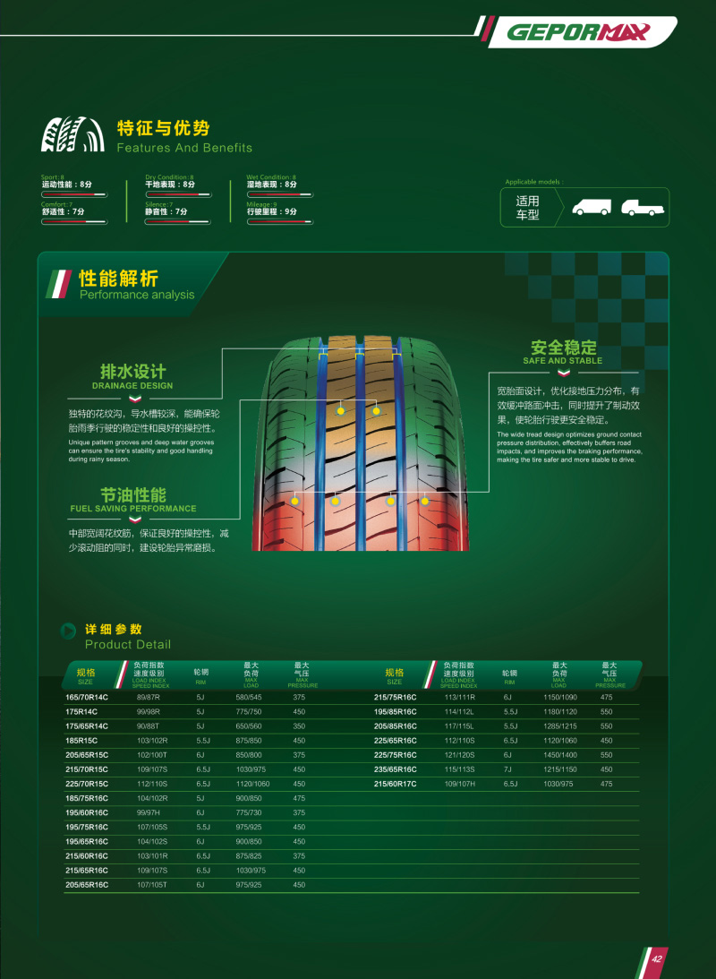 輕型商用車用輪胎,獨(dú)特的花紋溝,深排水槽,有較好的排水性和經(jīng)濟(jì)燃油性。