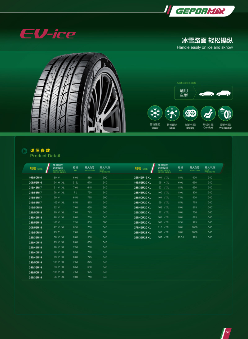 優(yōu)異的冰雪地操控性和駕駛性能;胎面使用特殊白炭黑配方,在低溫嚴寒環(huán)境中兼具低滾阻和優(yōu)秀濕滑性能。