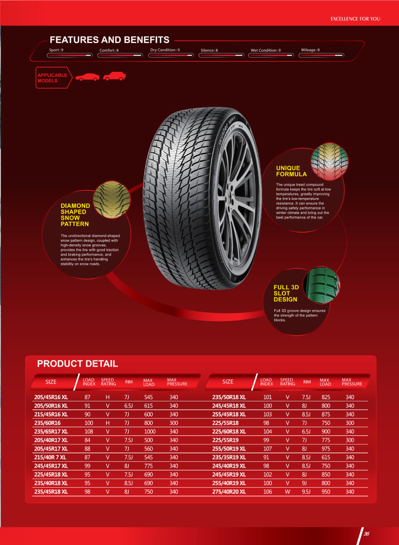 獨特胎面膠料配方及花紋,為輪胎提供良好的牽引力和制動性能,可保證在冬季氣候下的駕駛安全性能。