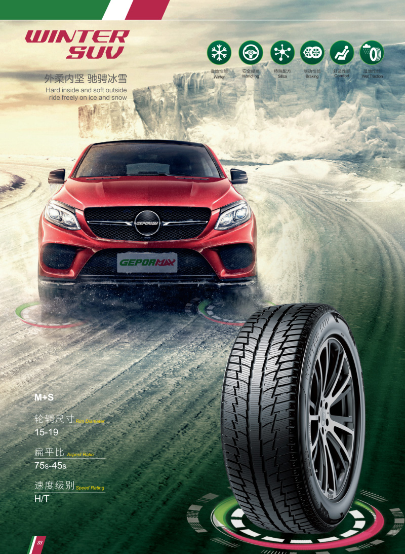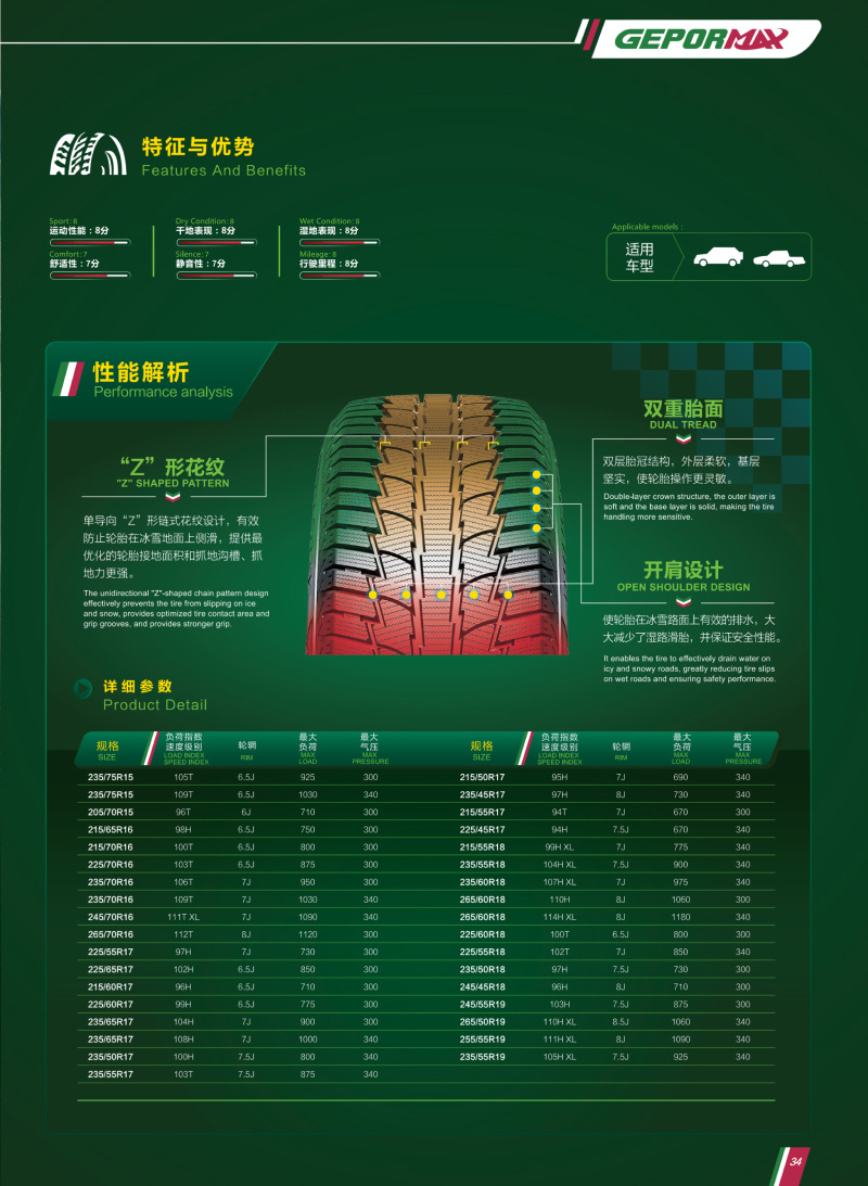 創(chuàng)新雙重胎面設(shè)計(jì),有效防止輪胎在冰雪地面上側(cè)滑,提供最優(yōu)化的輪胎接地面積和抓地溝槽、抓地力更強(qiáng)。